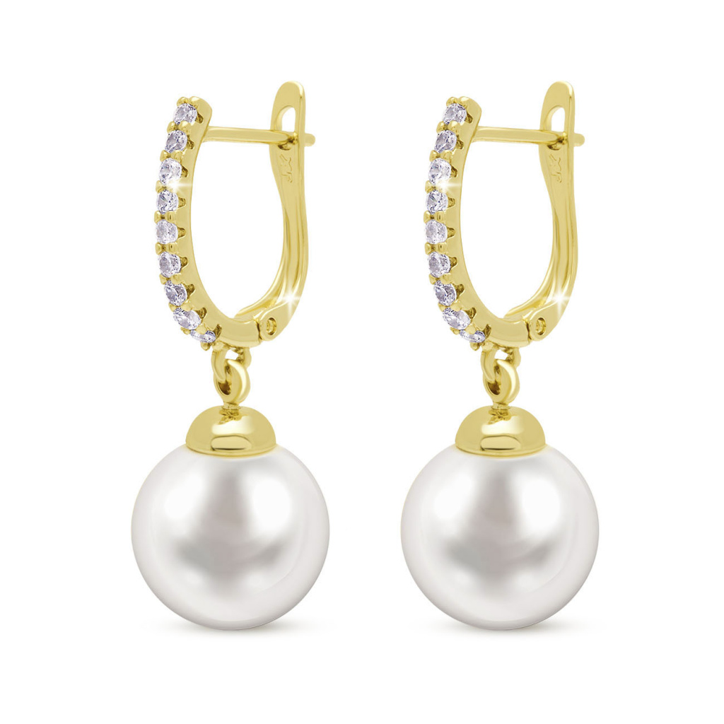 Noblesní visací náušnice s perlovým přívěskem a jemnou řadou drobných zirkonů na obvodu uchu vytvářejí harmonii ženské elegance a jemného třpytu. Díky ruskému patentu perfektně sedí a bezpečně drží, zatímco pohyb perly podtrhuje ladnost každého pohybu.