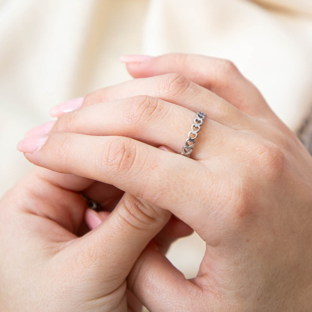 Nadčasový prsten z chirurgické oceli s motivem srdcí. Jemný, zářivý design o šířce 0,3 cm pro každodenní nošení.