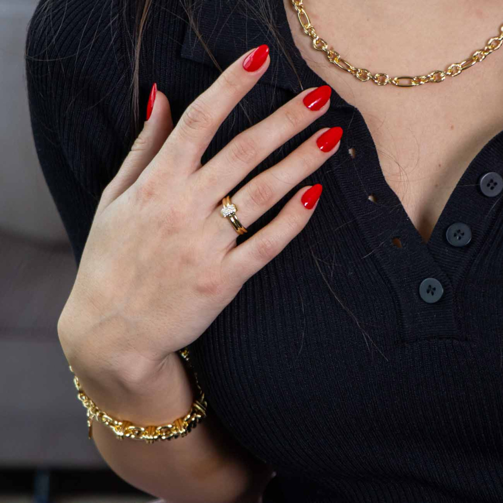 Jemný, ale výrazný – tento prsten je dokonalým spojením moderní geometrie a třpytivého lesku. Zářivě hladké linie prstenu se spojují v centrálním obdélníkovém motivu osazeném drobnými čirými zirkony, které zaujmou na první pohled. Nadčasový design pro každodenní eleganci i výjimečné chvíle.