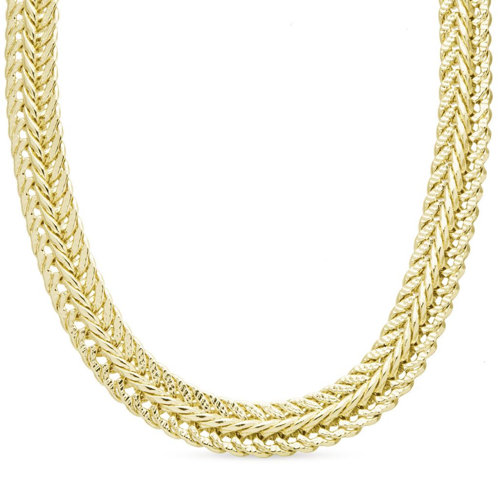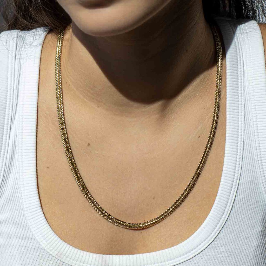 Tento výrazný řetízek zaujme na první pohled svým precizním pleteným vzorem, který působí moderně a zároveň nadčasově. Zářivý povrch pozlacený 14K zlatem dodává šperku luxusní charakter a dělá z něj dominantní doplněk každého outfitu. Ideální volba pro ty, kdo chtějí vyniknout s elegancí.