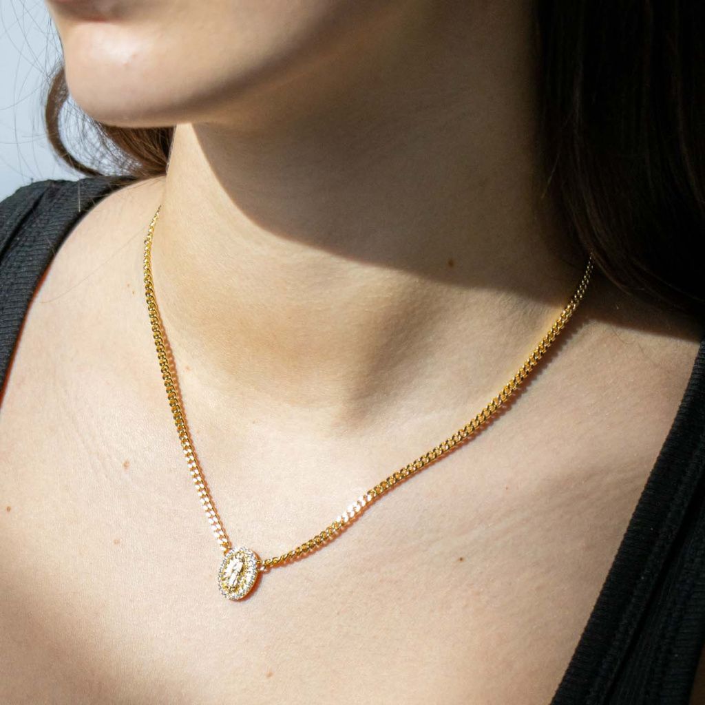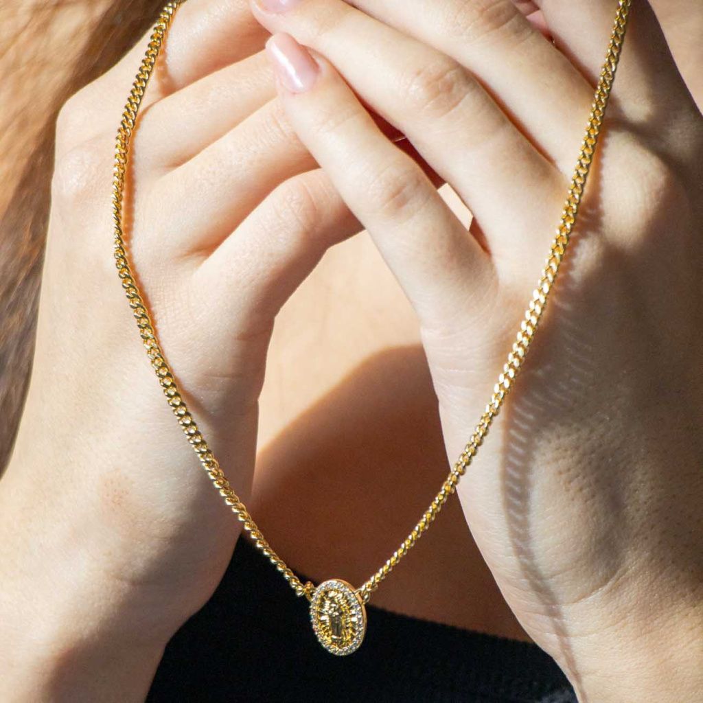 Nadčasový řetízek s precizně zpracovaným medailonkem působí elegantně a výrazně zároveň. Jemný třpyt lemujících zirkonů dodává šperku zářivý akcent, který krásně vynikne na dekoltu. Tento design spojuje klasickou symboliku s moderním zpracováním.