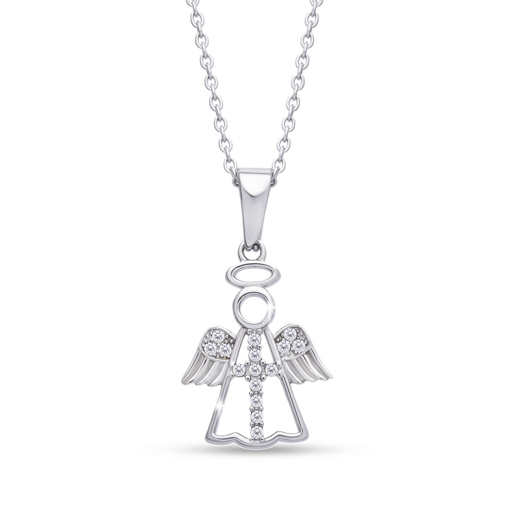 Elegantní řetízek s přívěskem anděla zdobeným čirými zirkony z chirurgické oceli.