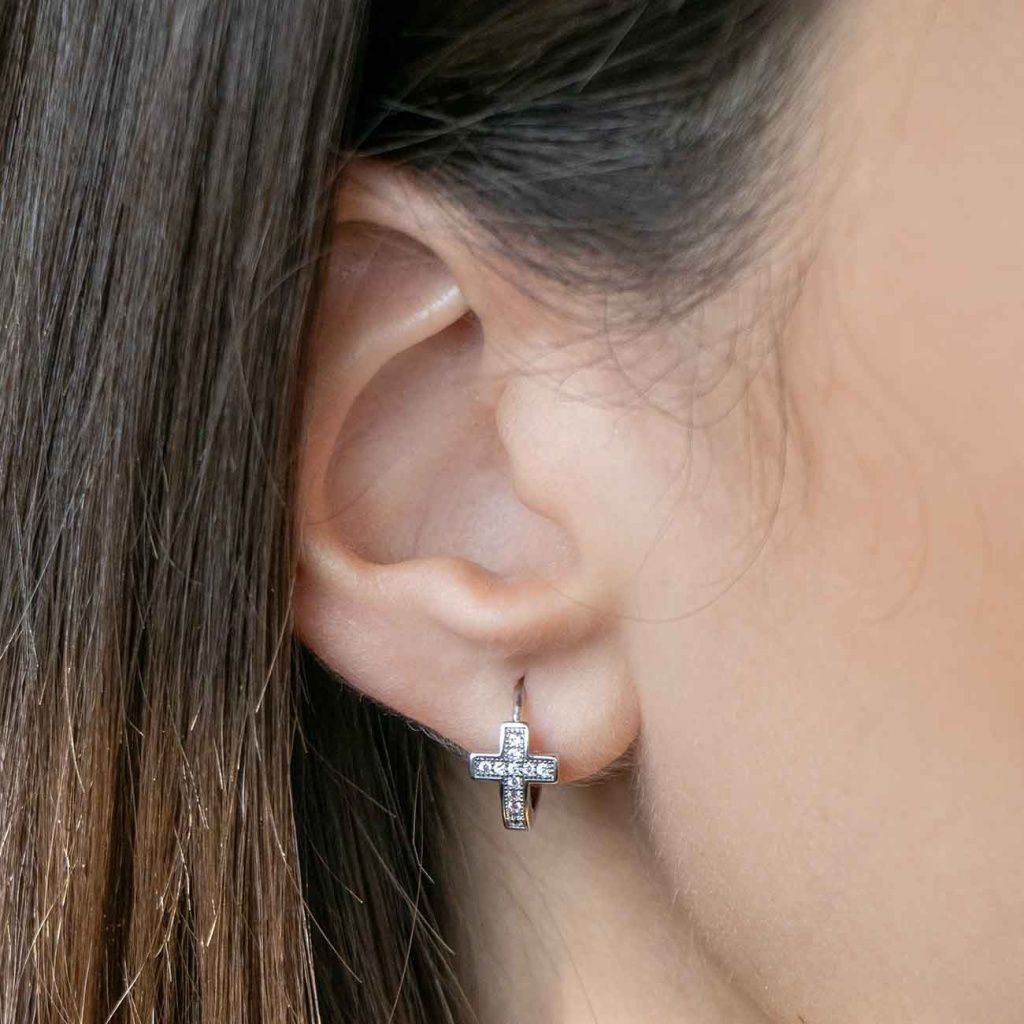 Tyto náušnice zaujmou výrazným motivem křížku, který je jemně osazen třpytivými zirkony. Precizní zpracování a zářivý lesk dodávají šperku nadčasový charakter a elegantní vzhled. Ideální volba pro každodenní nošení i jako stylový doplněk k výraznějším outfitům.