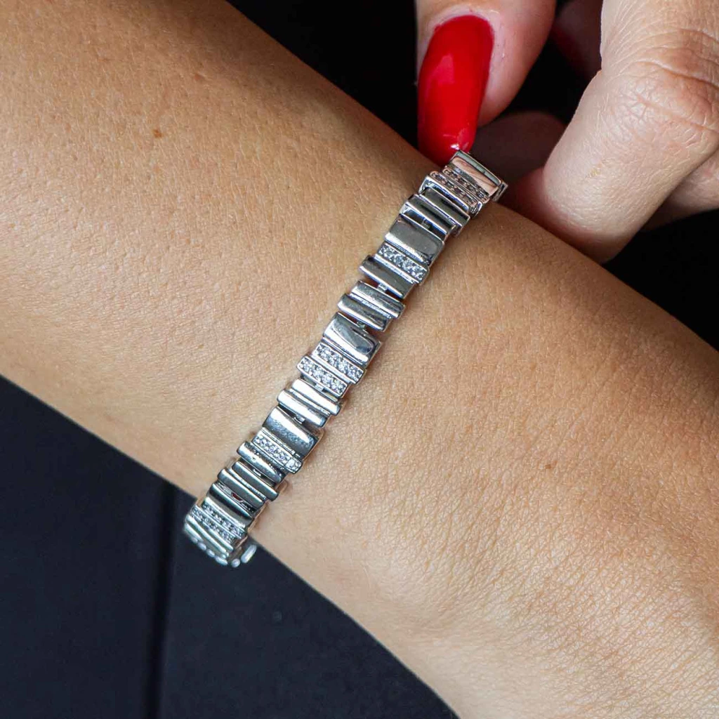 Elegantní náramek s precizně zpracovanými články a jemnými liniemi zirkonů působí čistě a nadčasově. Zářivý efekt dodává šperku sofistikovaný vzhled, který podtrhne Vaši eleganci bez zbytečné výraznosti. Ideální volba pro každodenní nošení i slavnostní chvíle.