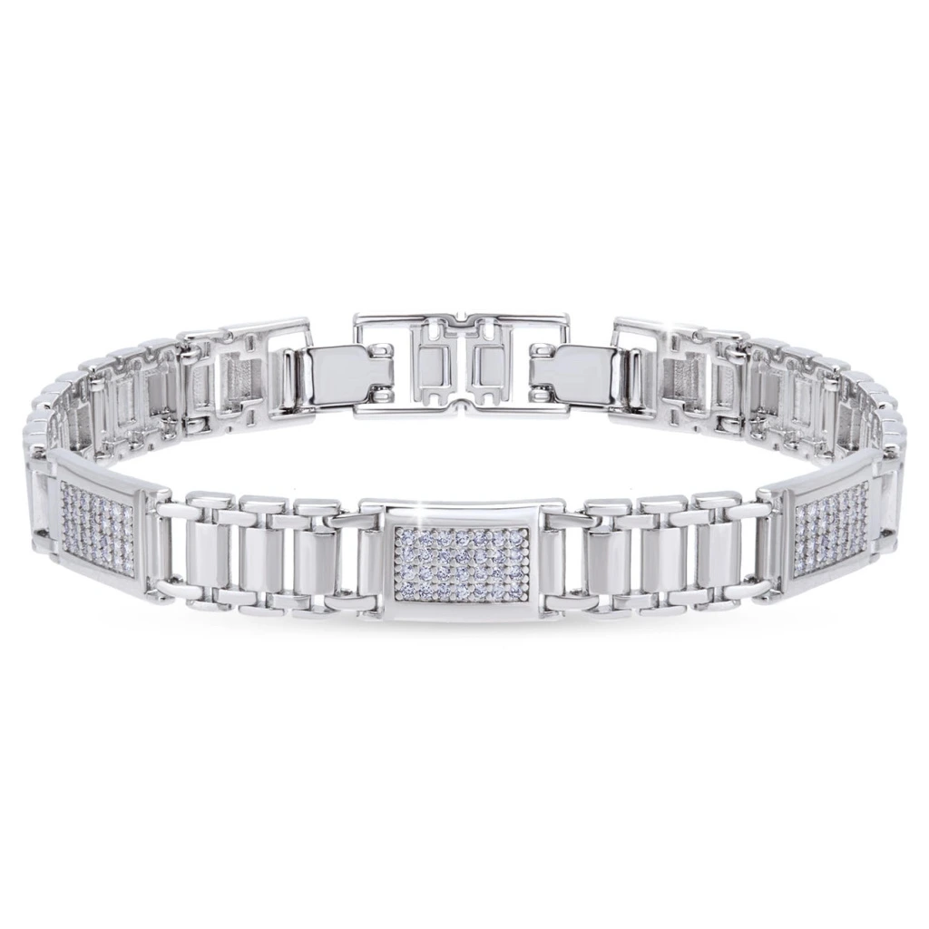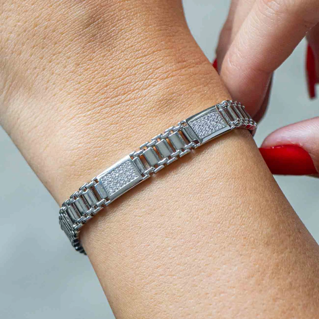 Precizně zpracovaný náramek s geometrickými články a zářivými zirkony působí elegantně a sebevědomě. Jeho výrazný, přesto nadčasový design dokonale doplní každý outfit a podtrhne Váš osobitý styl. Jemný třpyt dodává šperku luxusní nádech bez zbytečné okázalosti.
