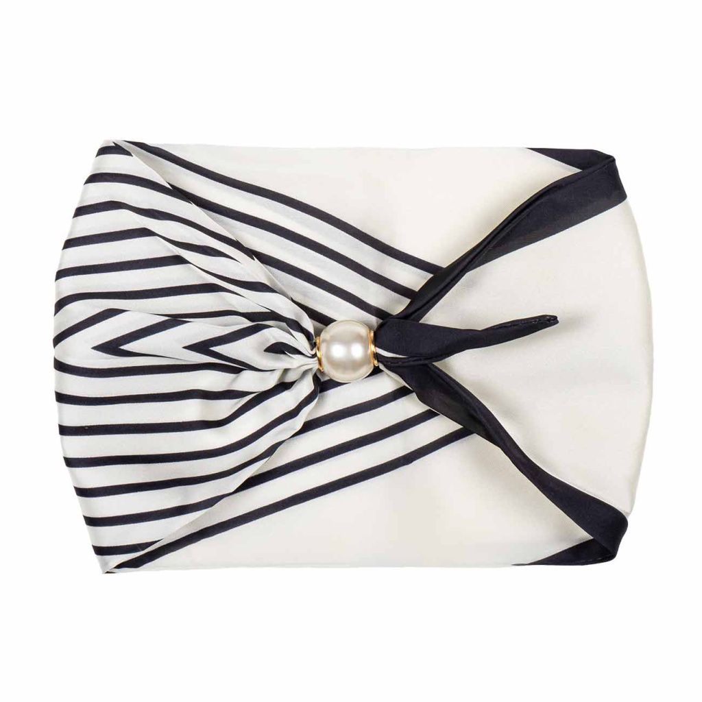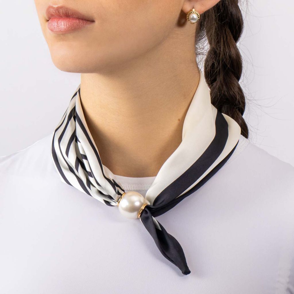 Tento jemný hedvábný šátek zaujme sofistikovanou kombinací krémového podkladu a precizních černých proužků. Zářivý lesk materiálu dodává doplňku luxusní nádech, zatímco kontrastní lem vytváří výrazný, ale stále nadčasový efekt. Perlová magnetická spona podtrhuje eleganci a zajišťuje pohodlné nošení.