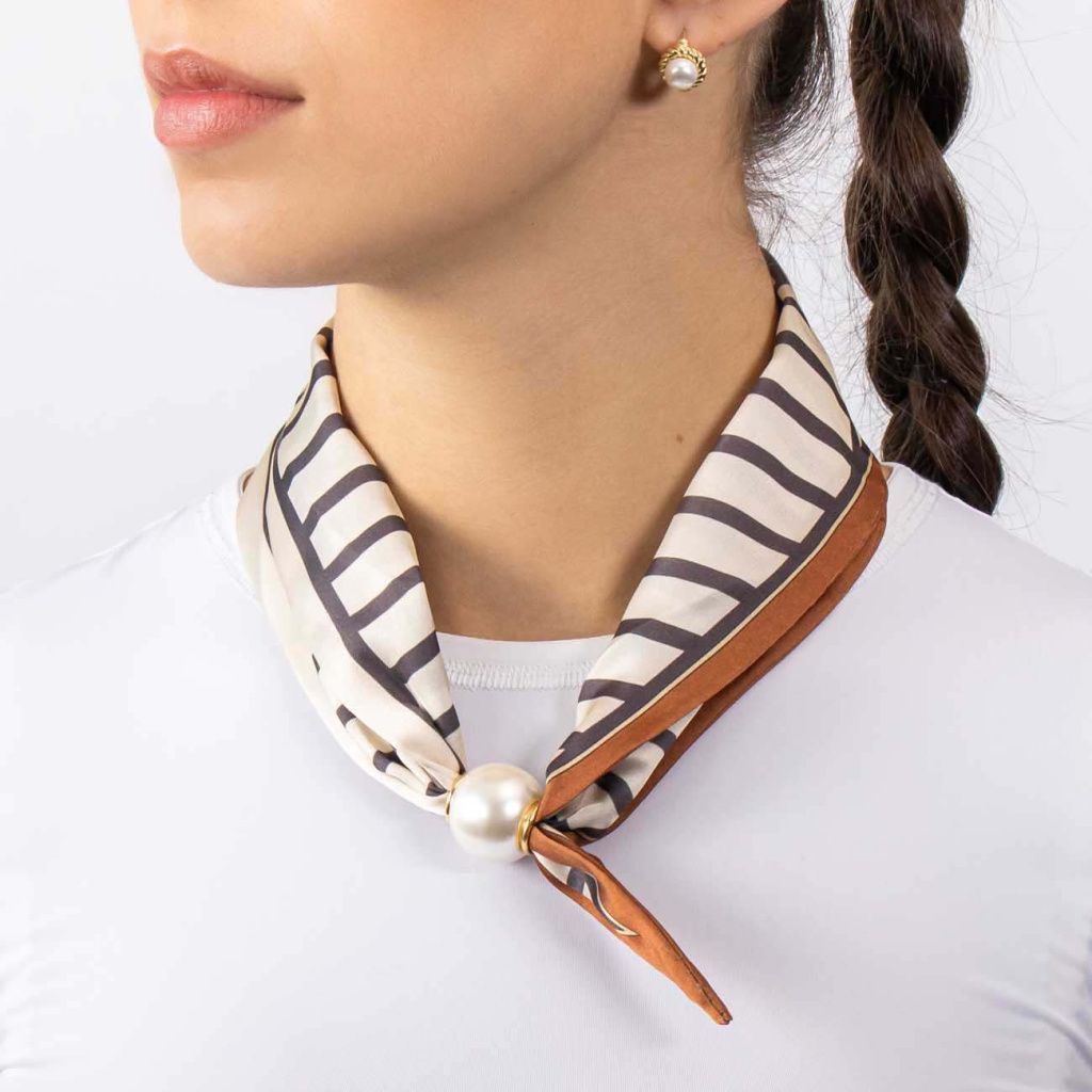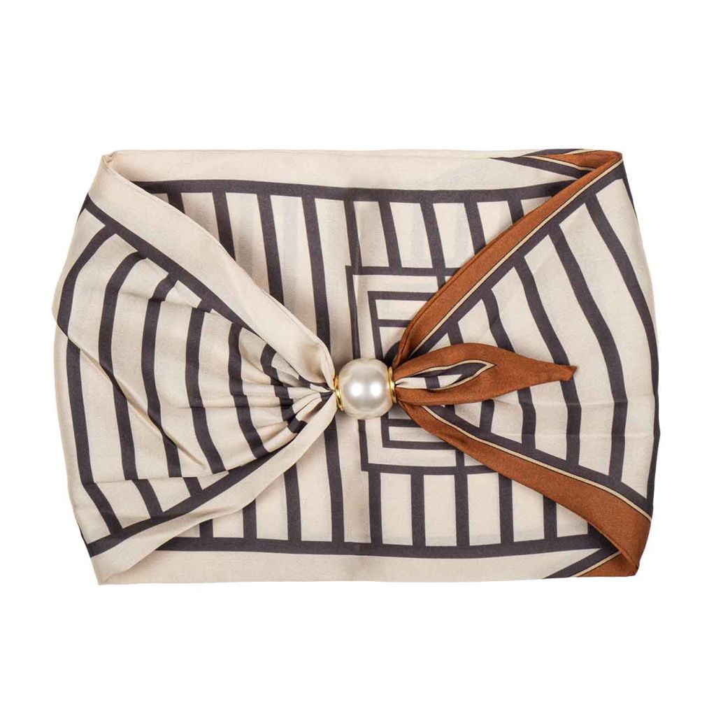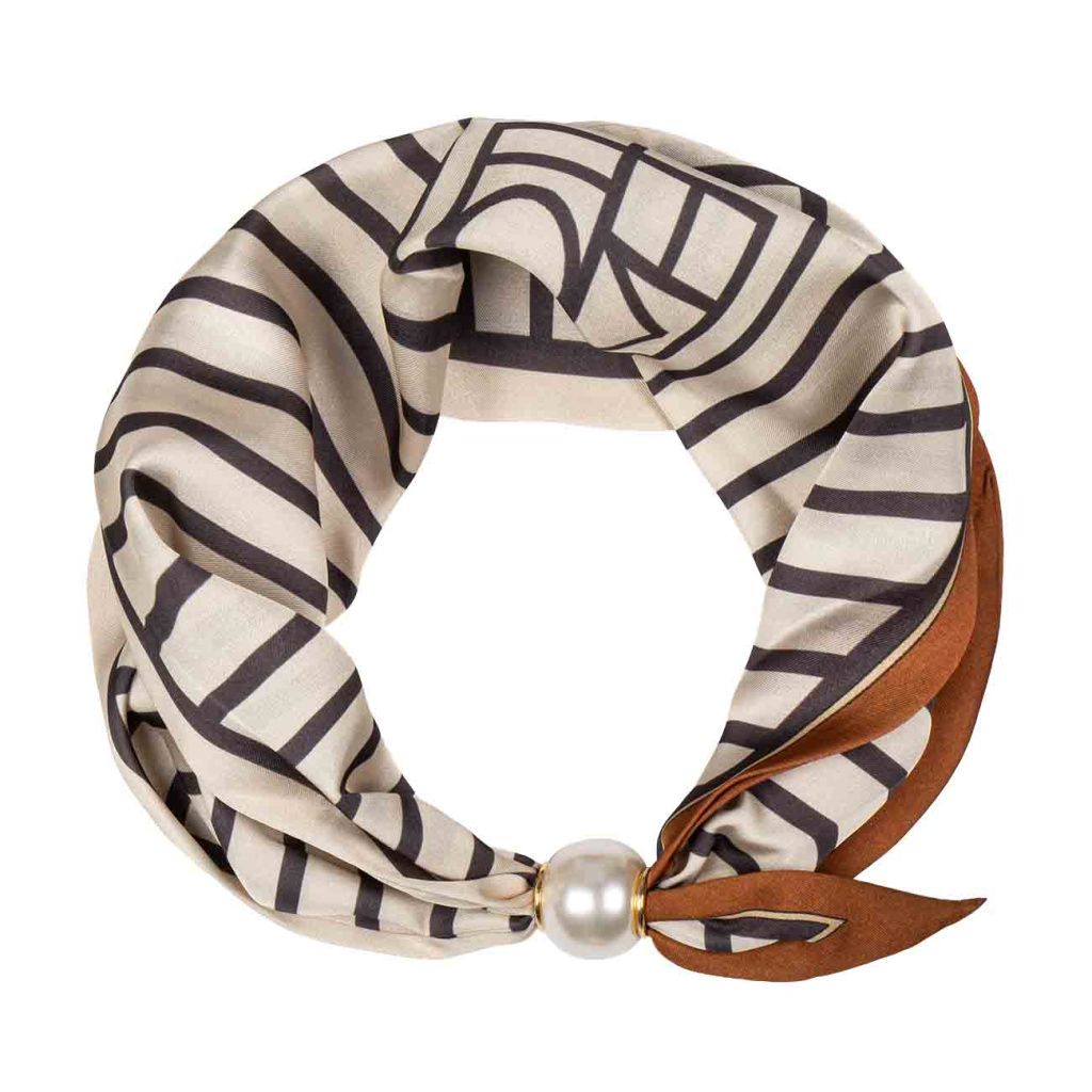 Tento hedvábný šátek zaujme precizním geometrickým vzorem v jemných béžových a hnědých tónech, které působí nadčasově a velmi sofistikovaně. Zářivý materiál krásně odráží světlo a dodává celku luxusní vzhled. Magnetická spona s perlou podtrhuje jeho elegantní charakter a zajišťuje maximální pohodlí při nošení.
