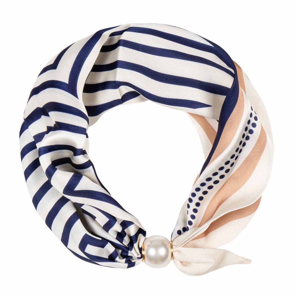 Tento zářivý hedvábný šátek v sobě spojuje precizní geometrické linie s jemnou harmonií barev. Kombinace hluboké modré, krémové a teplého béžového odstínu působí elegantně a současně výrazně. Díky perlové magnetické sponě získává šátek sofistikovaný detail, který podtrhne každý outfit.