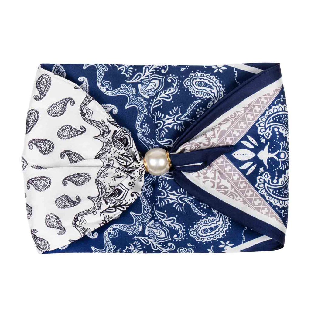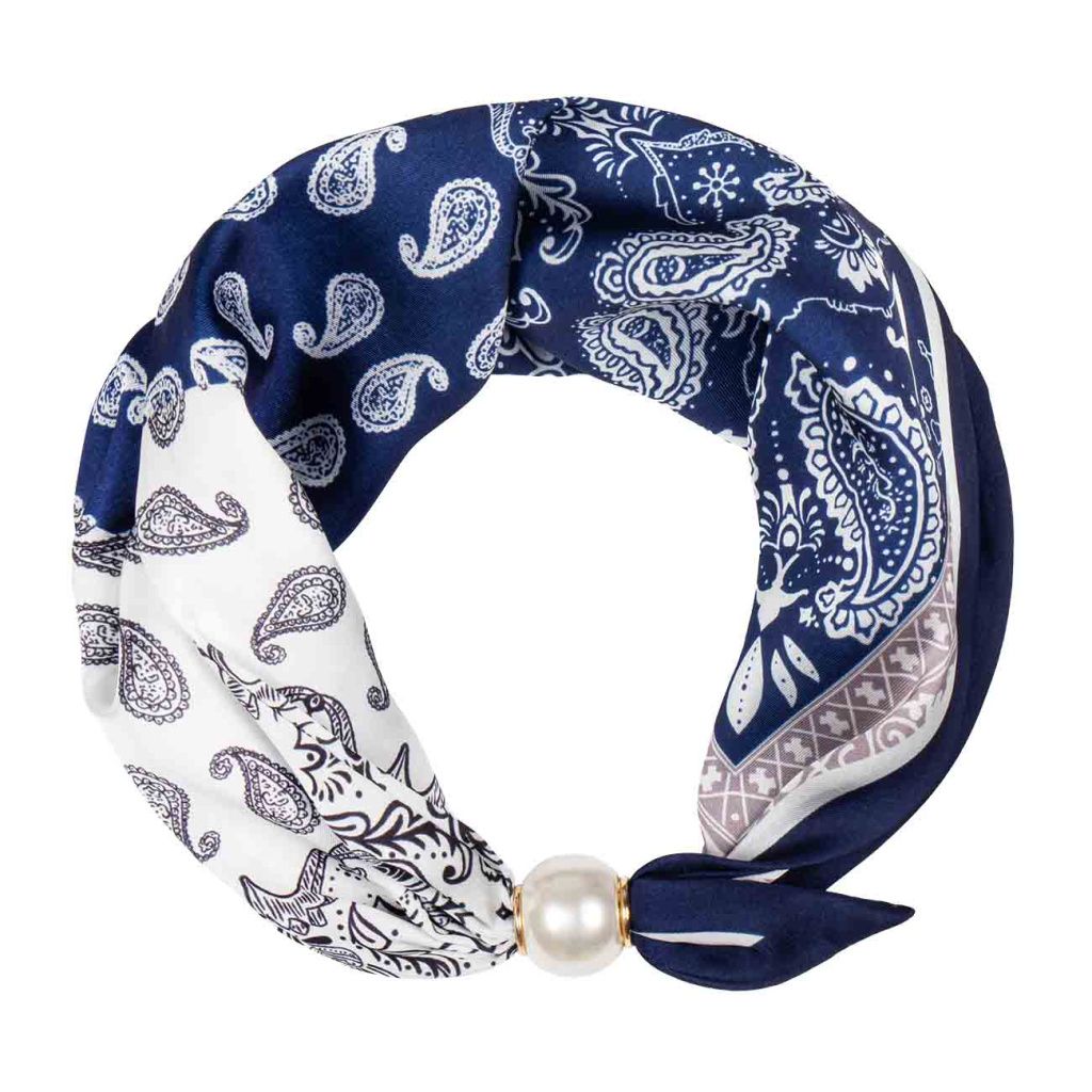 Tento jemný hedvábný šátek v elegantní modro-bílé kombinaci zaujme nadčasovým paisley vzorem a precizním provedením. Zářivý lesk materiálu dodává celku luxusní nádech, zatímco výrazný detail v podobě perlové spony působí velmi sofistikovaně. Díky praktickému zapínání si jej snadno upravíte přesně podle Vašeho stylu.