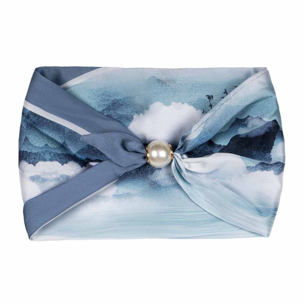 Zářivý hedvábný šátek inspirovaný akvarelovou krajinou působí mimořádně jemně a harmonicky. Plynulé přechody modrých odstínů vytvářejí uklidňující a nadčasový efekt, který podtrhne Vaši přirozenou eleganci. Perlová magnetická spona dodává celku precizní detail a zajišťuje pohodlné nošení.