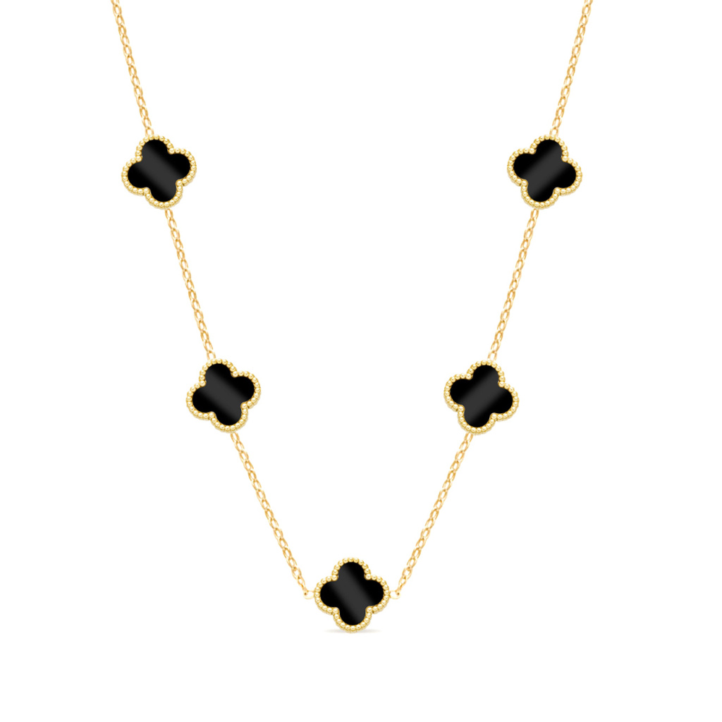 Jemný pozlacený 14k řetízek z chirurgické oceli. Pevný oboustranný přívěsek ve tvaru květiny, černé barvy.