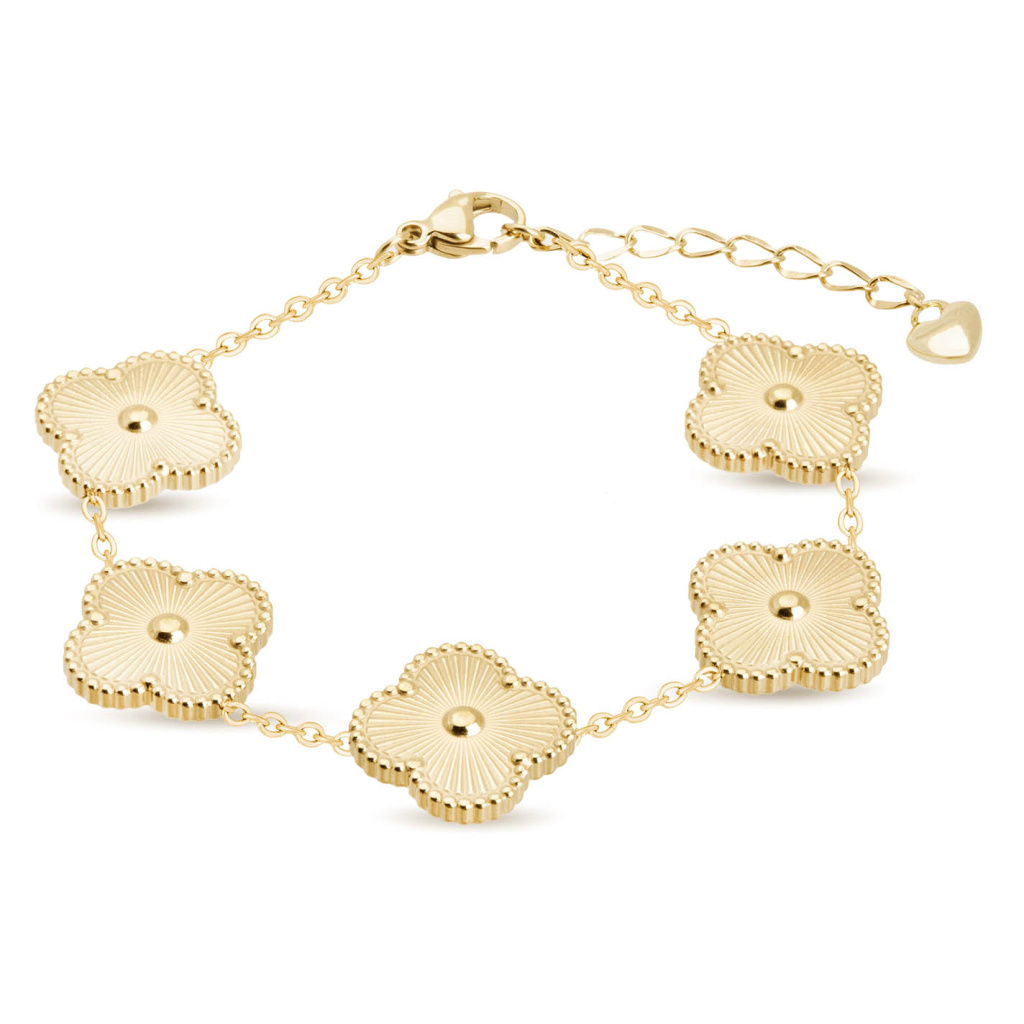 Stylový náramek zaujme dominantními květinami s jemně rytým povrchem, které vytvářejí výrazný, přesto elegantní celek. Čisté linie a precizní zpracování podtrhují sofistikovaný vzhled šperku, zatímco pozlacení 14K zlatem dodává náramku luxusní lesk. Díky prodlužovacímu řetízku se pohodlně přizpůsobí zápěstí a stane se nepřehlédnutelným doplňkem každodenního i slavnostního outfitu.