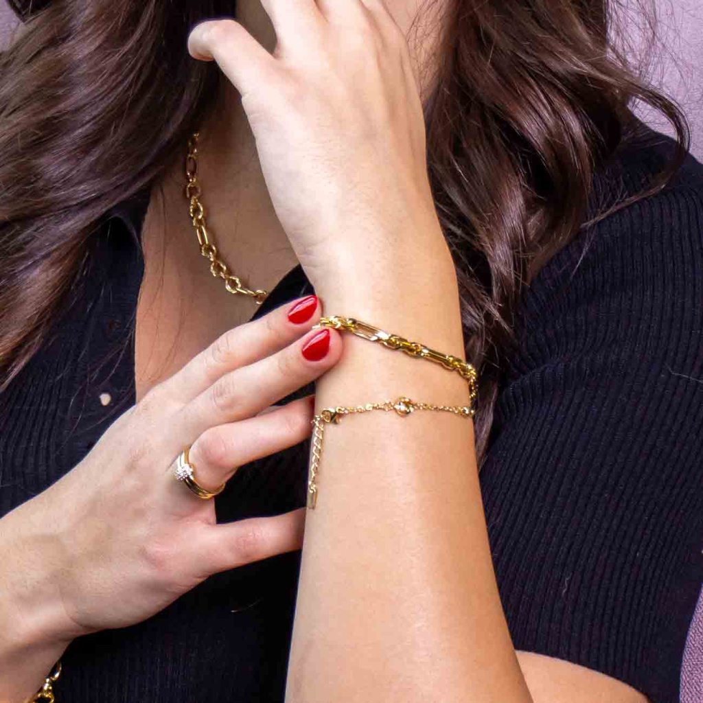 Rhodiovaný kov, pozlaceno 14K zlatem – Šperk je vyroben z odolného kovu s vrstvou rhodia a 14karátového zlata, které mu dodávají vysoký lesk, chrání jej před poškrábáním a zajišťují dlouhou životnost bez zčernání. Díky hypoalergenním vlastnostem je vhodný i pro citlivou pokožku. Neobsahuje nikl.
