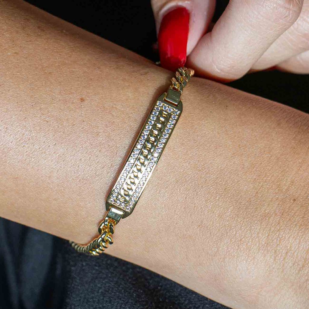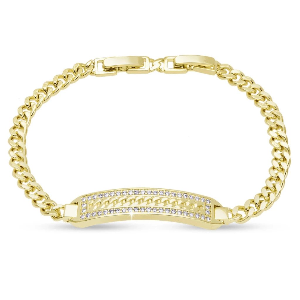 Výrazný náramek s precizně zpracovanou středovou destičkou zdobenou zirkony zaujme svým zářivým leskem i elegantní linií. Kombinace jemného řetízku a dekorativního prvku působí moderně a zároveň nadčasově. Skvěle doplní každodenní outfit i slavnostní look.