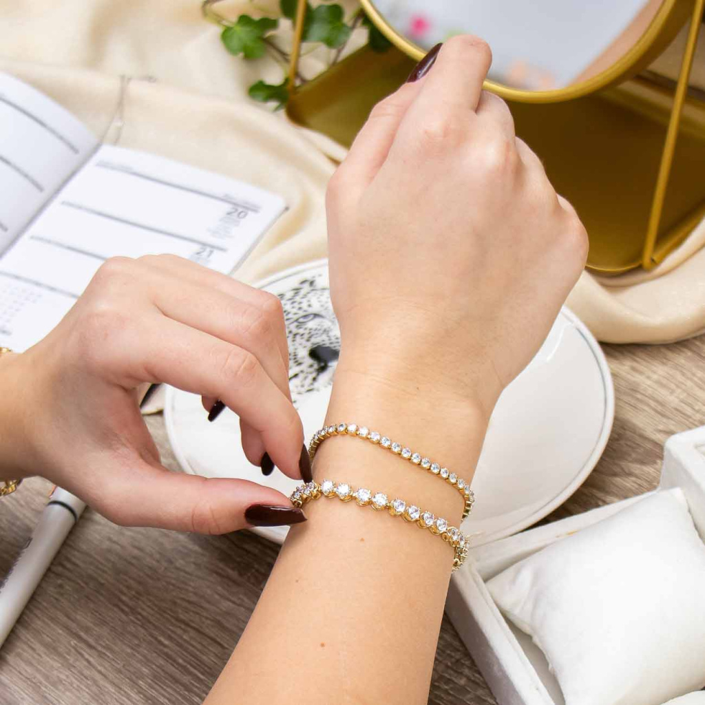 Zářivý náramek se zirkony z rhodiovaného kovu, pozlacený 14K. Nadčasový a elegantní doplněk pro každodenní i slavnostní styl.