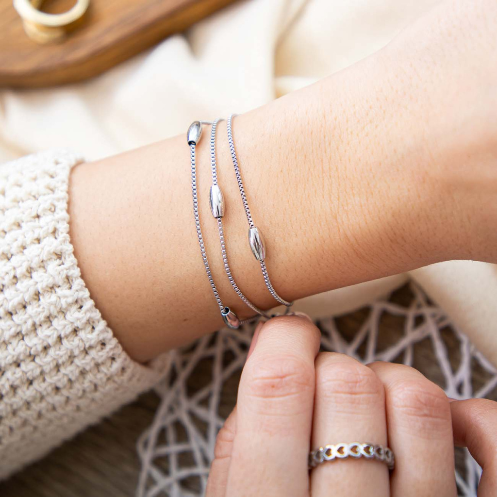 Precizní zpracování a jemný lesk vytváří dokonale vyvážený šperk pro každý den. Víceřadé provedení působí výrazně, přesto si zachovává lehkost a elegantní charakter. Hladké oválné komponenty dodávají náramku moderní, zářivý vzhled.