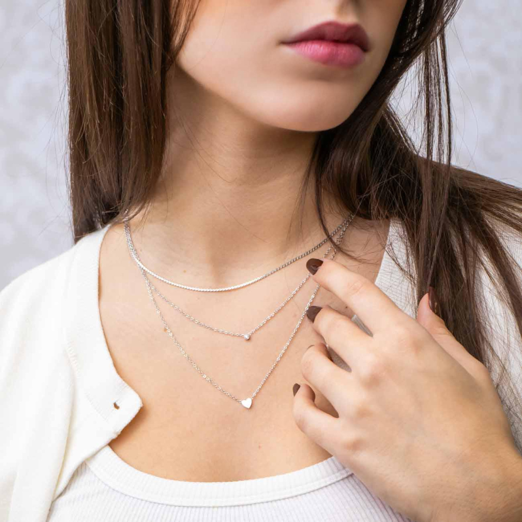 Elegantní trojitý řetízek s jemným srdíčkem a drobným zirkonem vytváří moderní vrstvený efekt.