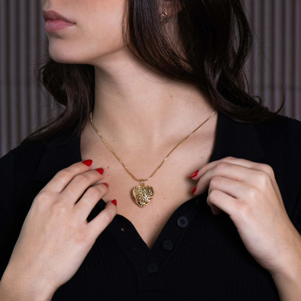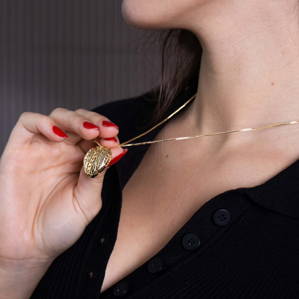 Stylový řetízek s dominantním přívěskem ve tvaru srdce zaujme originálním prostorovým zpracováním a kombinací lesklých i strukturovaných ploch. Plastický design dodává šperku hloubku a výraz, zatímco pozlacení 14K zlatem podtrhuje jeho elegantní a nadčasový charakter. Řetízek se krásně vyjímá samostatně a stává se výrazným doplňkem každodenního i elegantního outfitu.