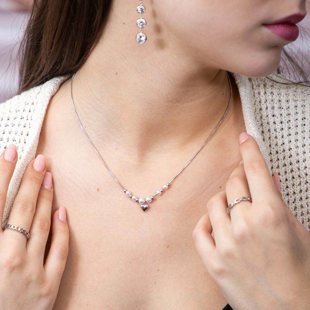 Náhrdelník z chirurgické oceli s perličkami a srdíčkem. Délka 41 + 5 cm, jemný a nadčasový design pro každý den.