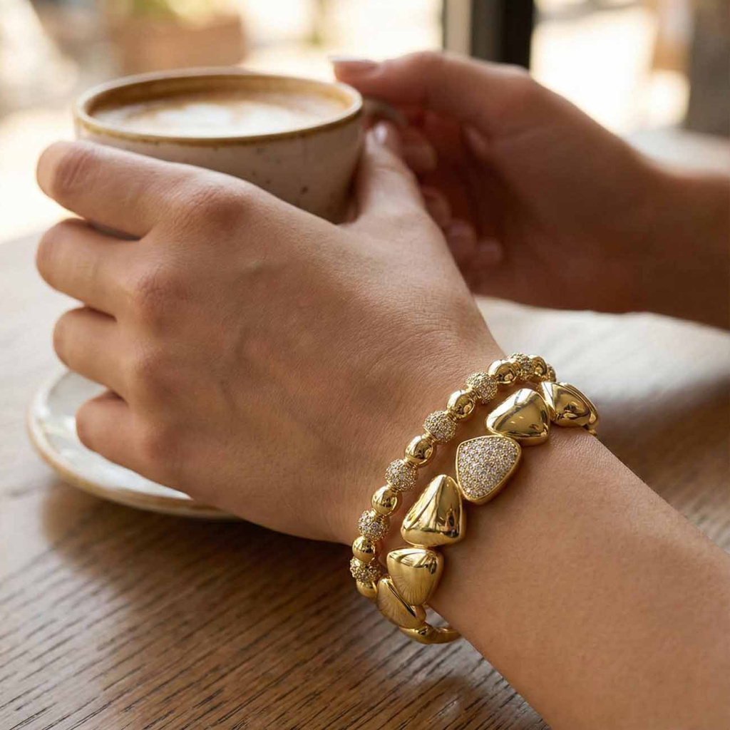 Elegantní náramek pozlacený 14K zlatem zdobený srdíčky a třpytivými zirkony působí luxusně a jemně zároveň.