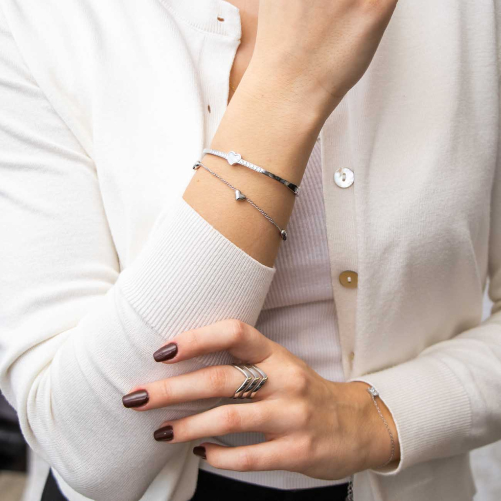 Jemný náramek se srdíčky z rhodiovaného kovu působí elegantně a romanticky, ideální pro každodenní nošení i jako milý dárek.