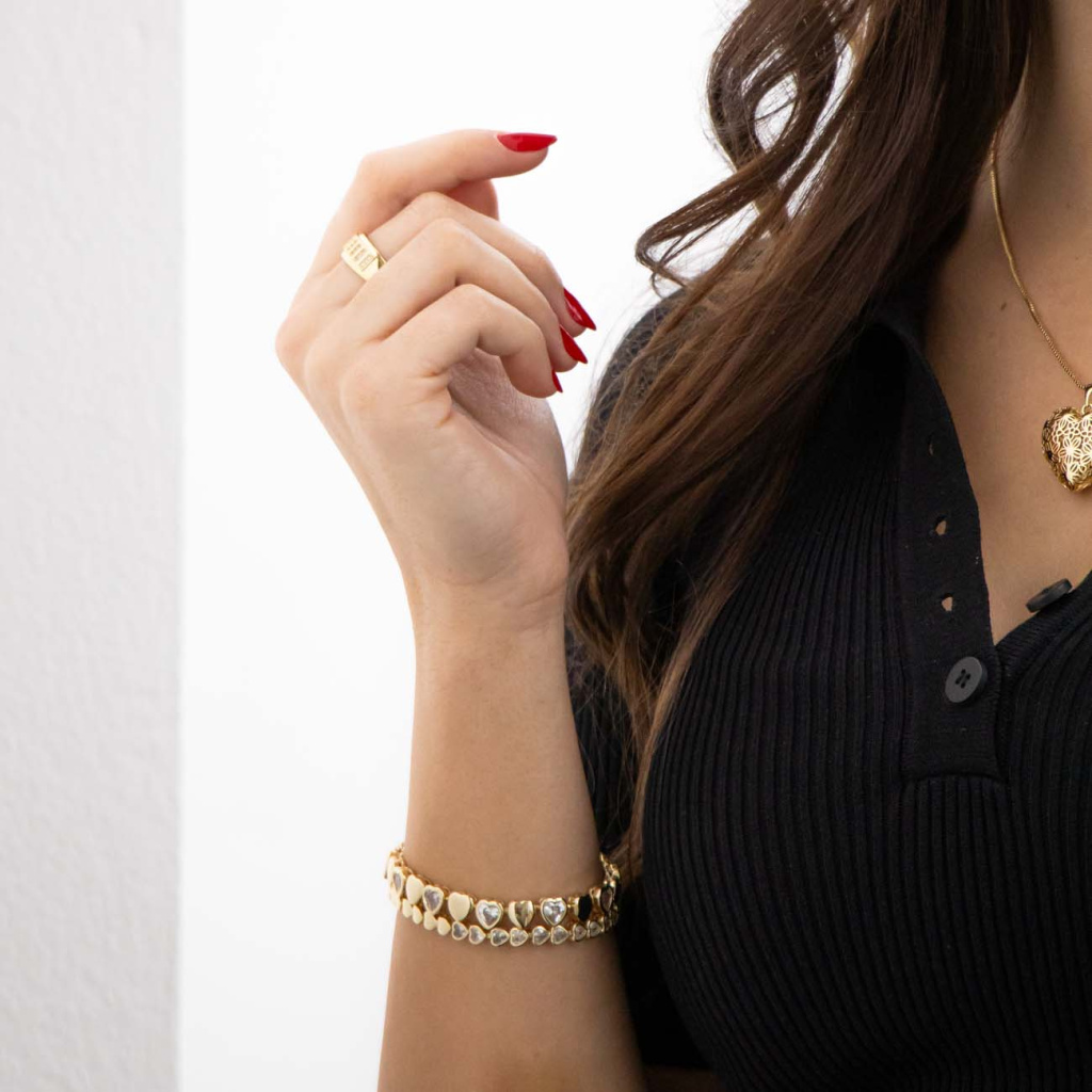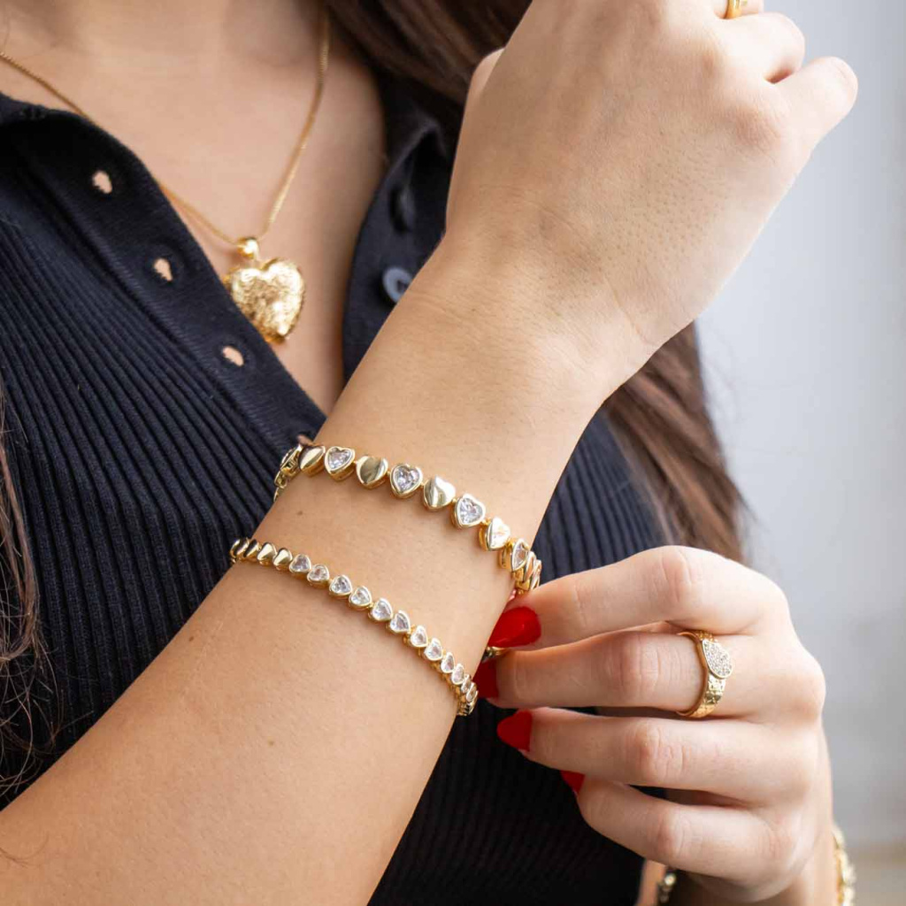 Romantický náramek složený z drobných srdíček osazených čirými zirkony je ideálním doplňkem pro každou příležitost. Zářivé kamínky v srdíčkových lůžkách se krásně třpytí při každém pohybu a dodávají šperku něžný a ženský vzhled.