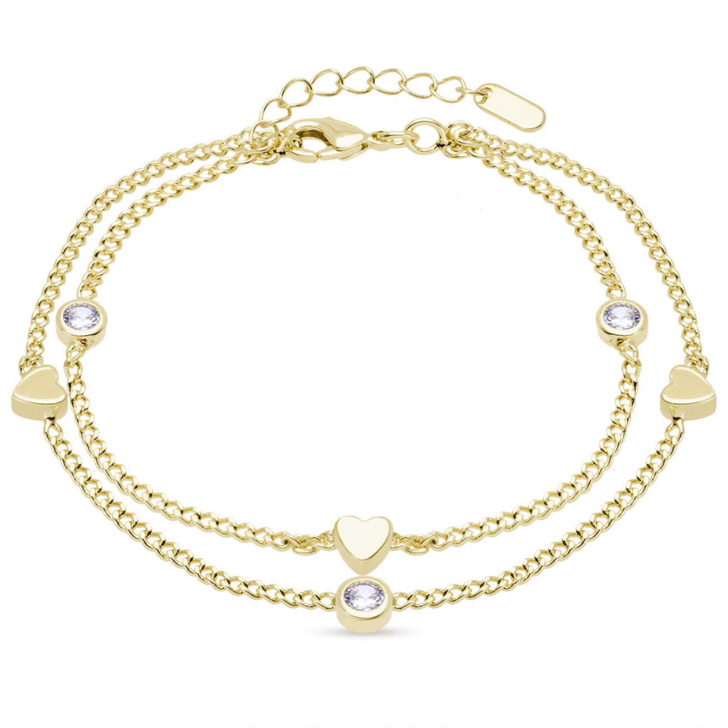 Jemný dvouřadý náramek s drobnými srdíčky a zářivými zirkonovými kolečky vyniká svou lehkostí a ženským kouzlem. Elegantní design se hodí k vrstvení i jako samostatný doplněk, který decentně ozdobí zápěstí a dodá outfitu romantický akcent.