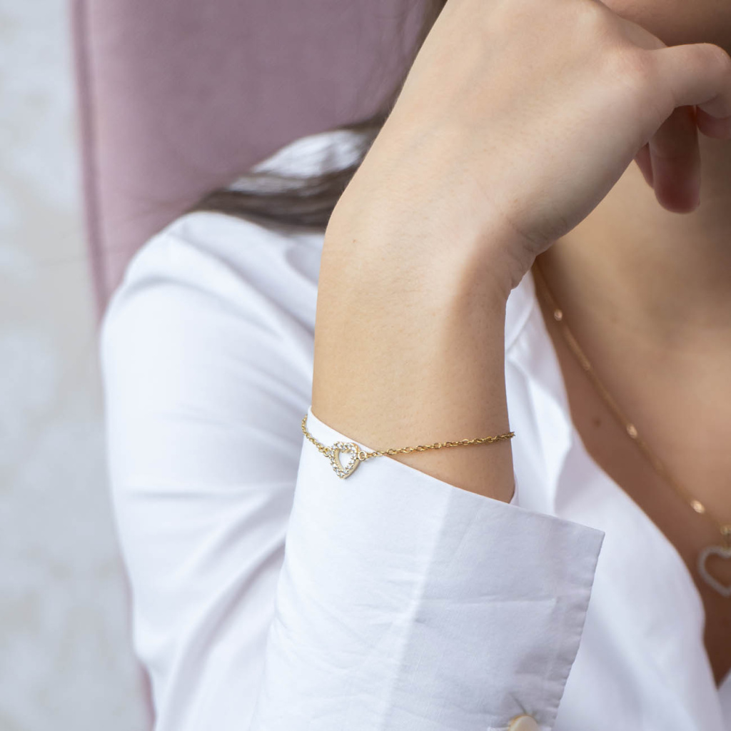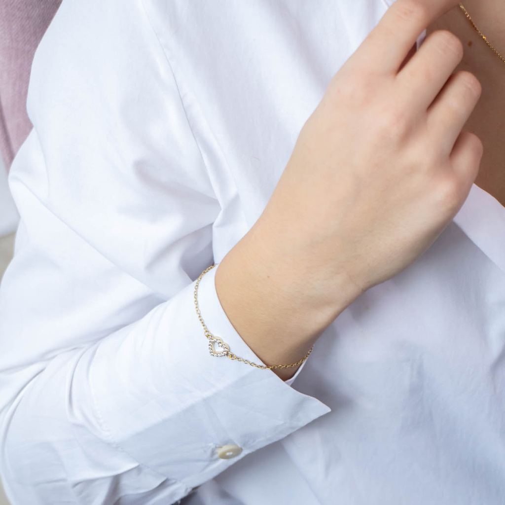 Romantický náramek se zářivým srdíčkem osazeným drobnými zirkony působí něžně a elegantně. Vhodný jako milý dárek z lásky nebo jako každodenní doplněk, který rozzáří každý outfit.