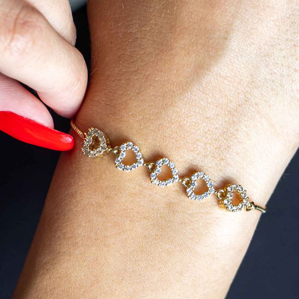 Tento náramek okouzlí svou jemností a romantickým motivem srdíček, která jsou precizně osazena zářivými zirkony. Lehký a nadčasový design působí elegantně a něžně, díky čemuž je ideálním doplňkem pro každodenní nošení i speciální chvíle. Skvěle podtrhne Vaši ženskost a cit pro detail.