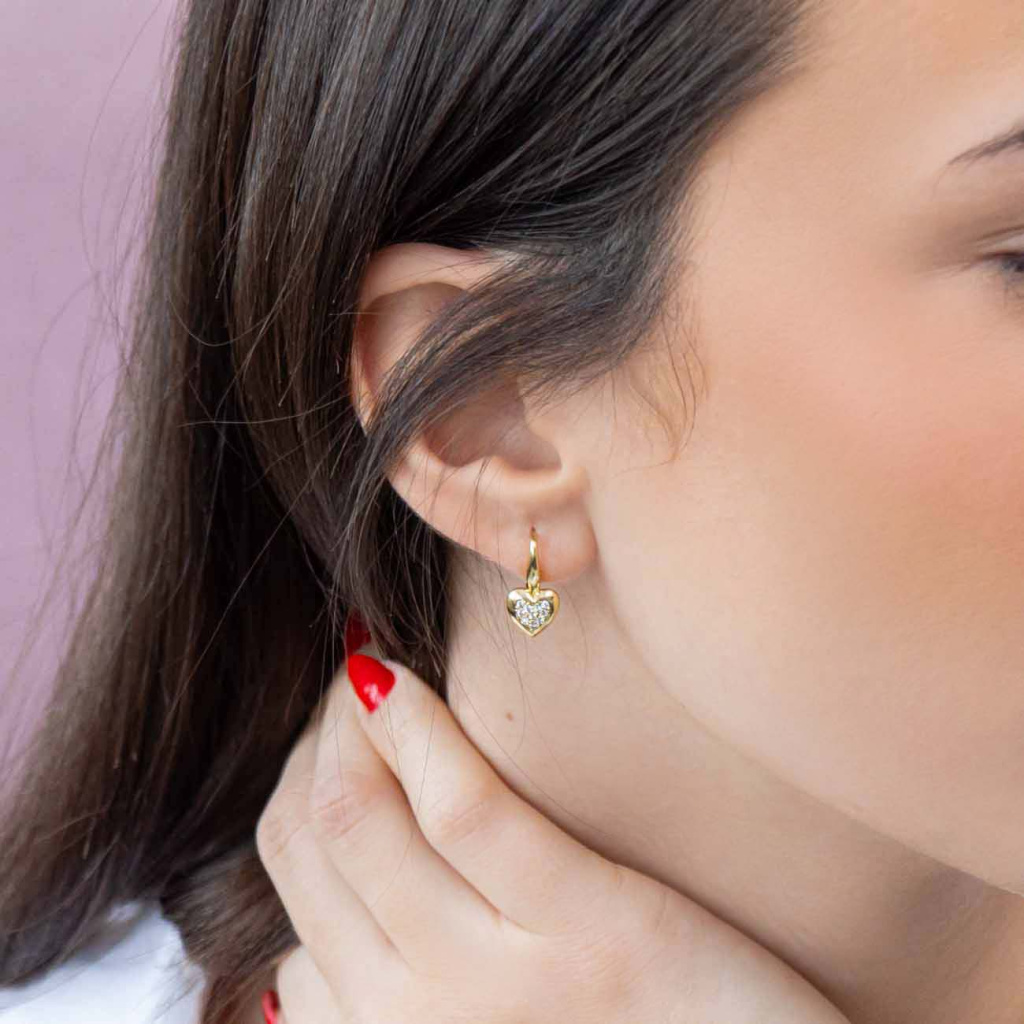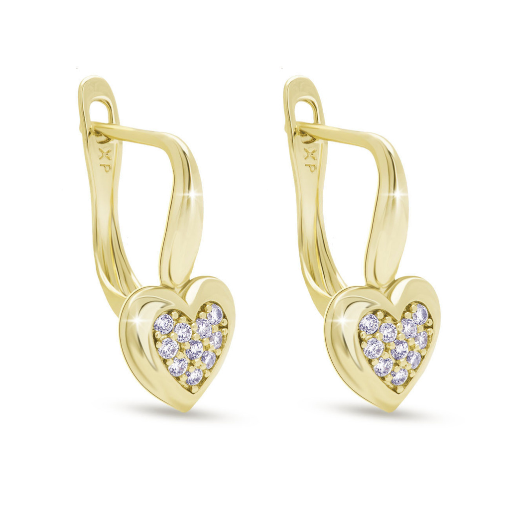 Elegantní náušnice v lesklém zlatém tónu zaujmou jemným motivem srdce osazeným čirými zirkony, které dodávají šperku decentní třpyt. Romantický design doplňuje pohodlné zapínání na klapku (ruské zapínání), které zajistí bezpečné nošení. Perfektní volba pro každodenní nošení i jako něžný dárek.
